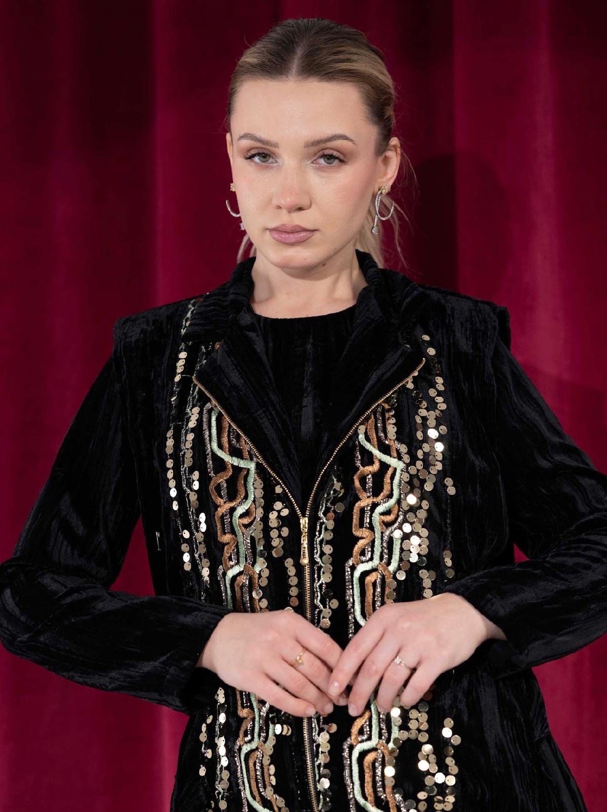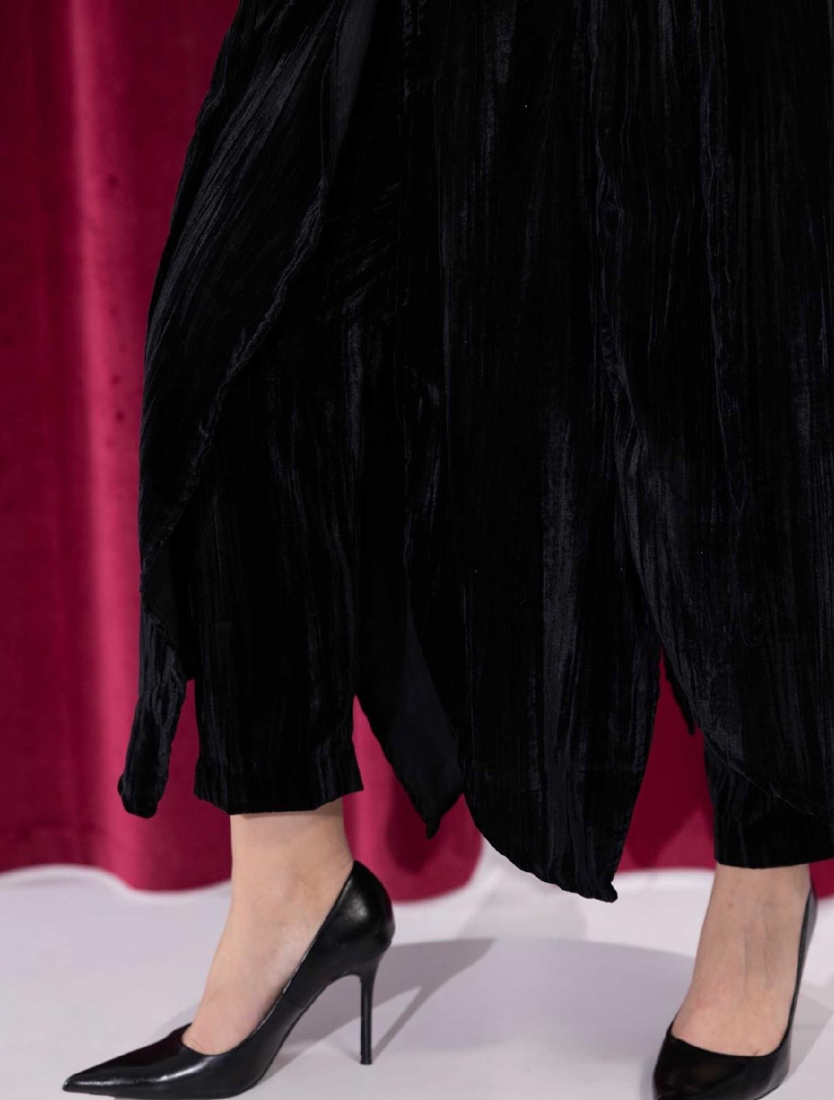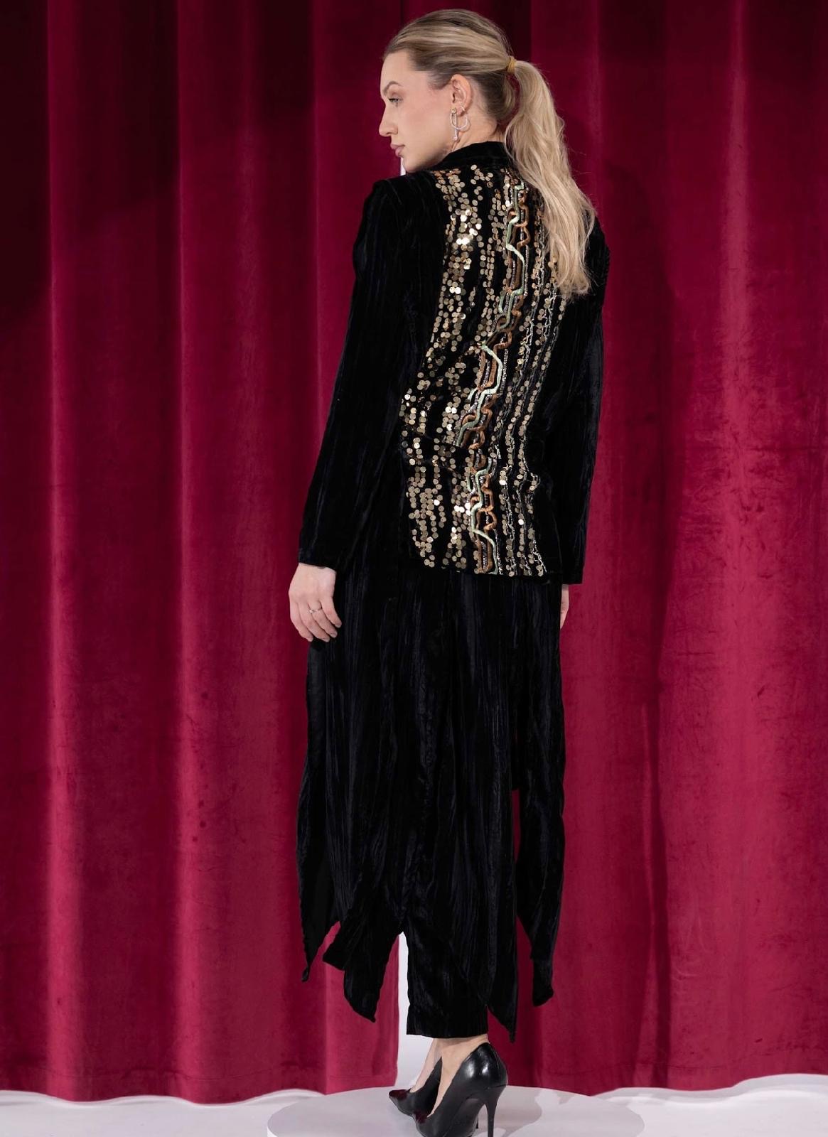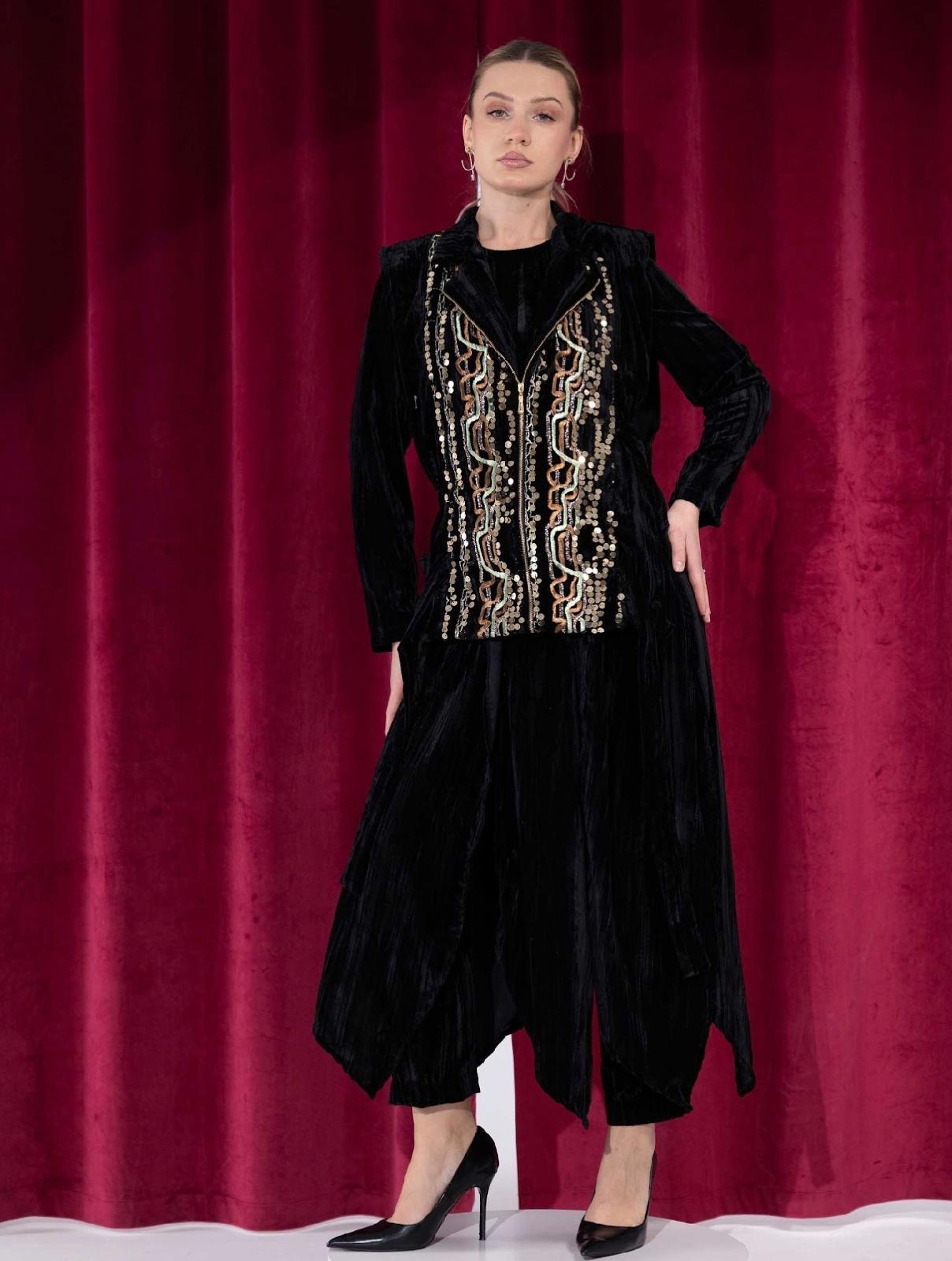 – 3-piece set: velvet vest, pants, and dress